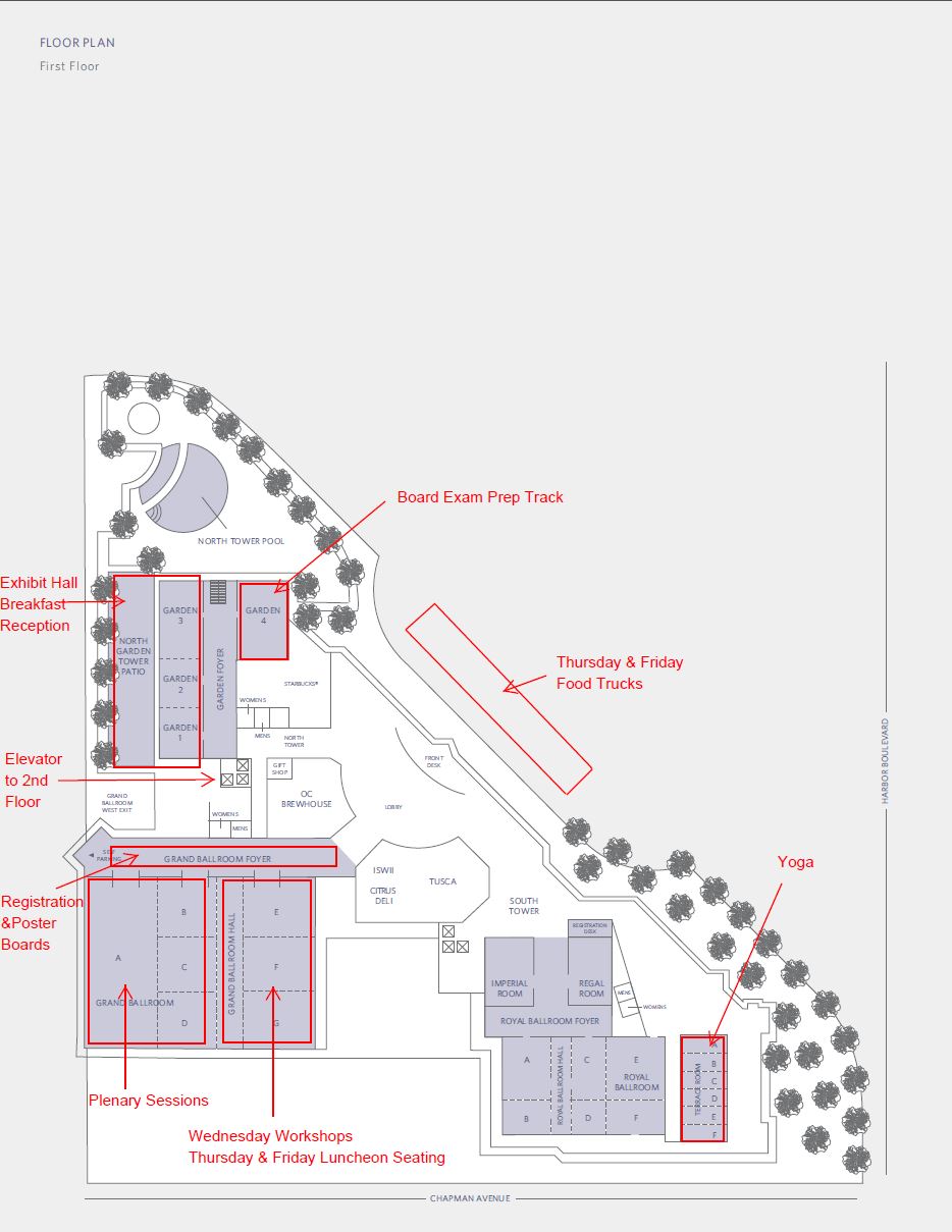 The CSAM Conference events take place int he North Tower of the Hyatt Orange County. The majority of events take place ont he 1st floor, with the MERF, Mutual Help Support Meetings, Speaker Lounge and Lactation Room located on the 2nd floor up the elevator.
